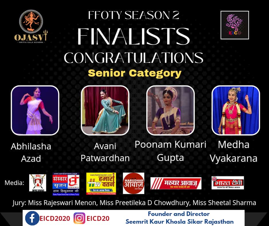 प्रतियोगिता के फाइनल में पहुंचे प्रतियोगी, जिनमें जूनियर कैटेगरी में नव्या चौरसिया, सौम्या प्रियदर्शनी, जयती तमराकर एवं सिरिजा बिस्वास और सीनियर कैटेगरी में अभिलाषा आज़ाद, अवनी पटवर्धन,पूनम कुमारी गुप्ता, मेधा व्यकरणा शामिल रहे।